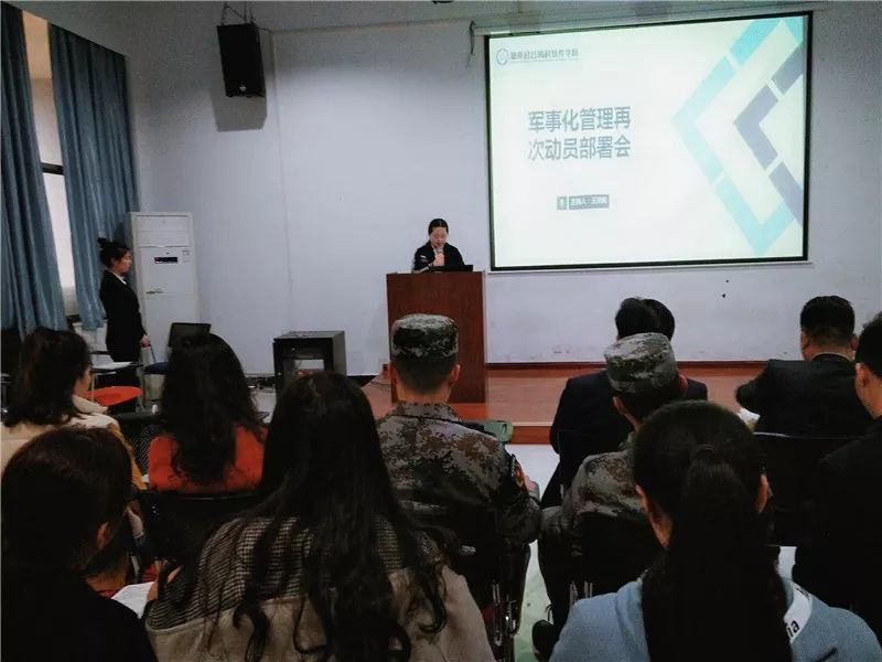 教质部主任曾长玉老师在会议上宣读了3月19日军事化管理的《会议纪要》精神,即:“要求学院所有部门能够提高认识、统一思想、广泛发动、凝心聚力、齐抓共管、责任上肩、举洪荒之力助推我院军事化管理跨上新台阶,达成上课迟到率为零,寝室内务卫生不合格率为零,所有公共场合抽烟人次为零,不按时归寝为零,课堂违纪人次为零的目标”。