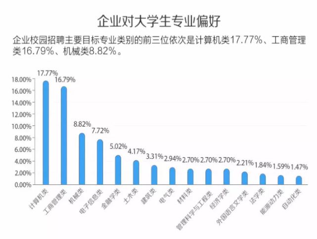另一份调研数据中可发现,企业校招对计算机类、工商管理类和机械类专业的大学生“情有独钟”,而计算机类更是独居榜首。