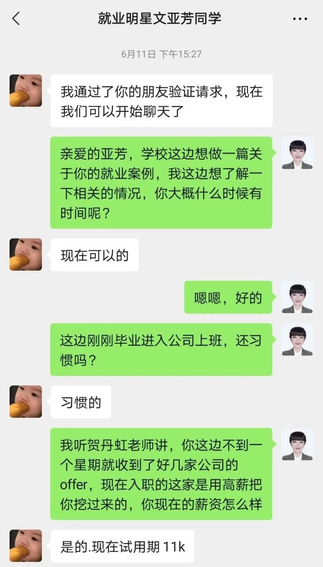 文亚芳是2021年5月从硅谷毕业的,毕业之后凭借着出色的学习履历、获奖荣誉和在学校做项目的经验,毕业仅一个月就收到了多家公司的Offer,据贺丹虹老师所说,文亚芳目前就职的这家公司,是用高薪把她挖过去的。